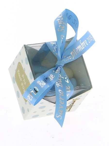 Tarif affiché cubes dragées confection artisanale garni de dragées et son ruban personnalisé.