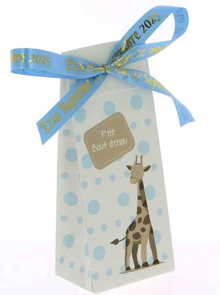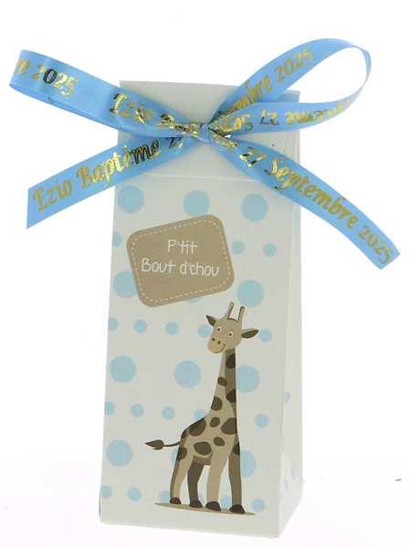Offrez une boite girafe élégante avec un ruban personnalisé pour célébrer le baptême ou la naissance de votre enfant. Un cadeau de baptême jungle original, raffiné et 100% MADE IN FRANCE, parfait pour remercier vos invités avec douceur et authenticité.