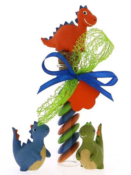 Offrez à vos invités une magnifique figurine dinosaure accompagnée de son éprouvette et de ses dragées haute qualité. Une décoration de baptême originale et coloré pour des cadeaux invités uniques et personnalisés.