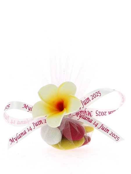 Pour un mariage élégant et coloré, découvrez mes créations en tulle garnies de dragées délicates. Inspirée de la fleur des îles, chaque réalisation apporte une touche colorée à votre cérémonie. Offrez à vos invités un cadeau unique, personnalisé avec un ruban imprimé portant vos noms ou le texte de votre choix pour un souvenir inoubliable.